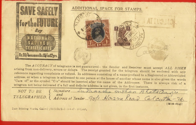 This is 1949 telegram from used Calcutta to Chaumuhani.